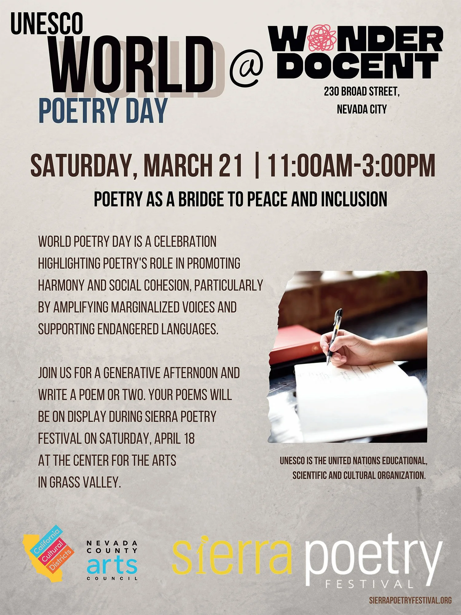 Join us on March 21 at Wonder Docent for a generative afternoon and write a poem or two. Your poems will be on display during Sierra Poetry Festival on Saturday, April 18 at the Center for the Arts.
